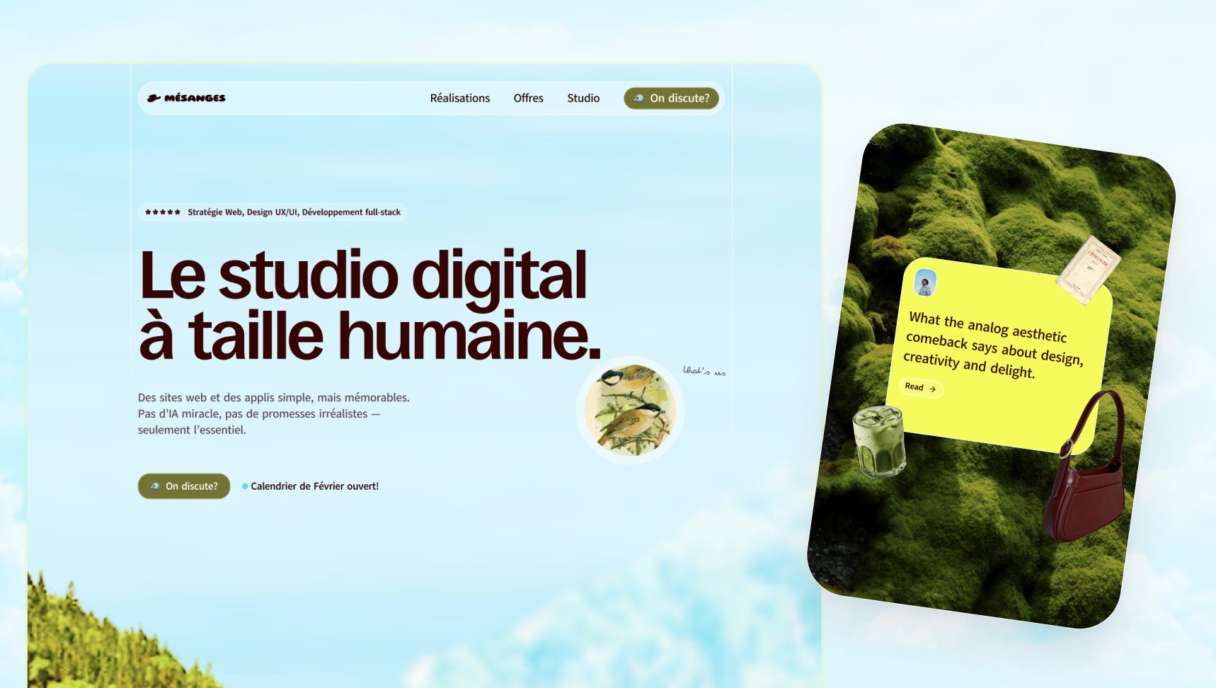 Brand design and landing page design for Mésanges Studio, a french web agency that'll launch in 2026.